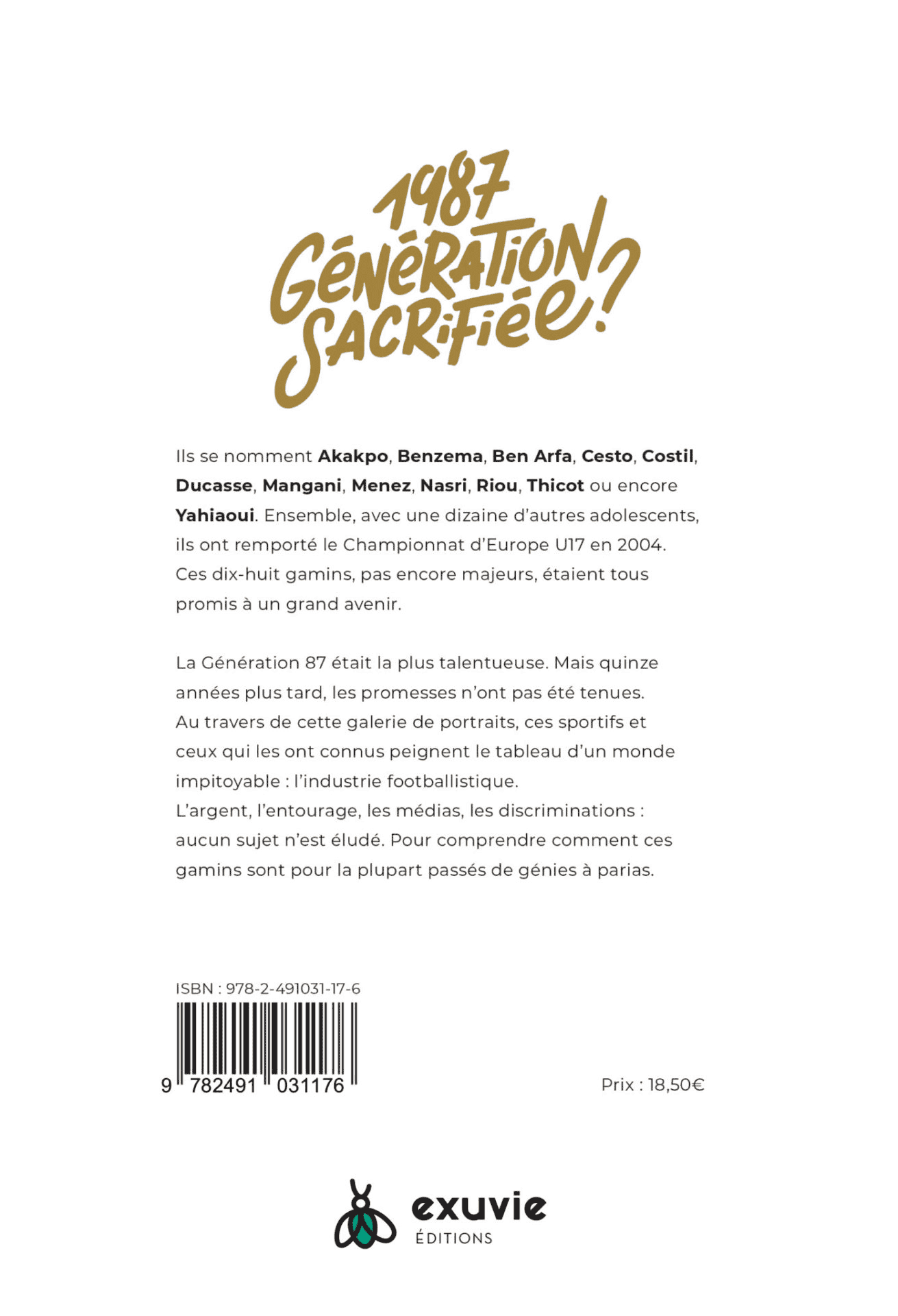 La Génération 87 était la plus talentueuse. Mais quinze années plus tard, les promesses n’ont pas été tenues. Au travers de cette galerie de portraits, ces sportifs et ceux qui les ont connus peignent le tableau d’un monde impitoyable : l’industrie footballistique. L’argent, l’entourage, les médias, les discriminations : aucun sujet n’est éludé. Un livre pour comprendre comment ces gamins sont pour la plupart passés de génies à parias.