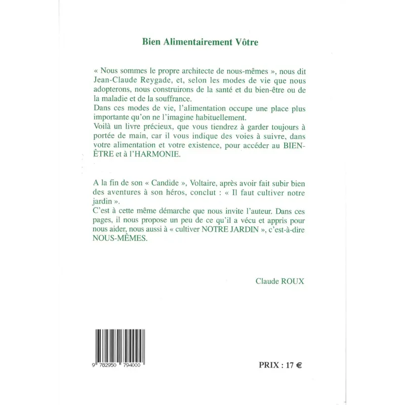 « Nous sommes le propre architecte de nous-mêmes », nous dit Jean-Claude Reygade, et, selon les modes de vie que nous adopterons, nous construirons de la santé et du bien-être ou de la maladie et de la souffrance. Dans ces modes de vie, l’alimentation occupe une place plus importante qu’on ne l’imagine habituellement. Voilà un livre précieux, que vous tiendrez à garder toujours à portée de main, car il vous indique des voies à suivre, dans votre alimentation et votre existence, pour accéder au BIENÊTRE et à l’HARMONIE.