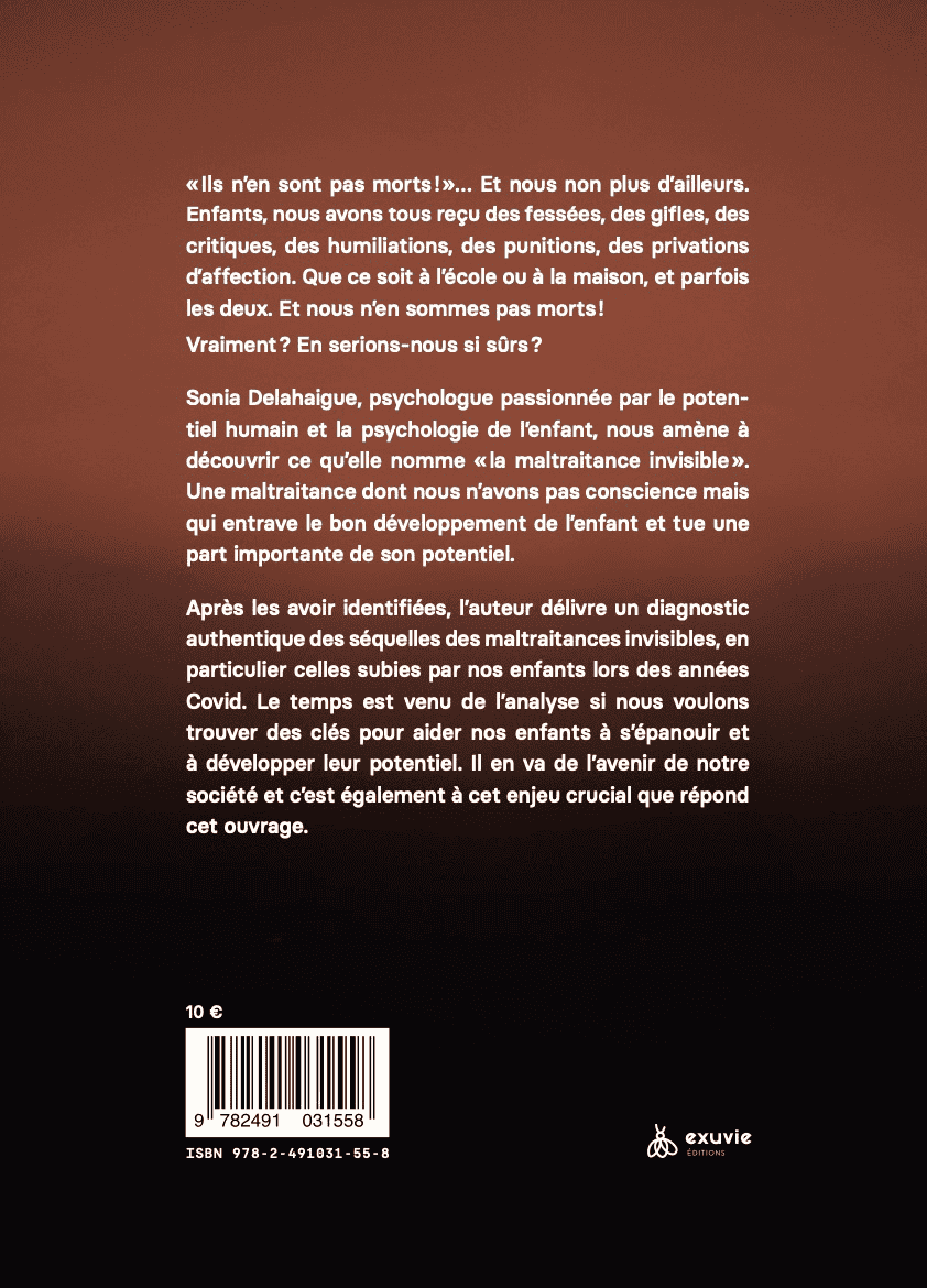 Dans la plupart des situations l’enfant semble si bien s’adapter, mais ne serait-ce pas qu’une illusion Sonia Delahaigue, psychologue passionnée par le potentiel humain et la psychologie de l’Enfant, nous amène à découvrir ce qu’elle nomme « la maltraitance invisible ». Une maltraitance dont nous n’avons pas conscience mais qui entrave le bon développement de l’enfant et tue une part importante de son potentiel.
