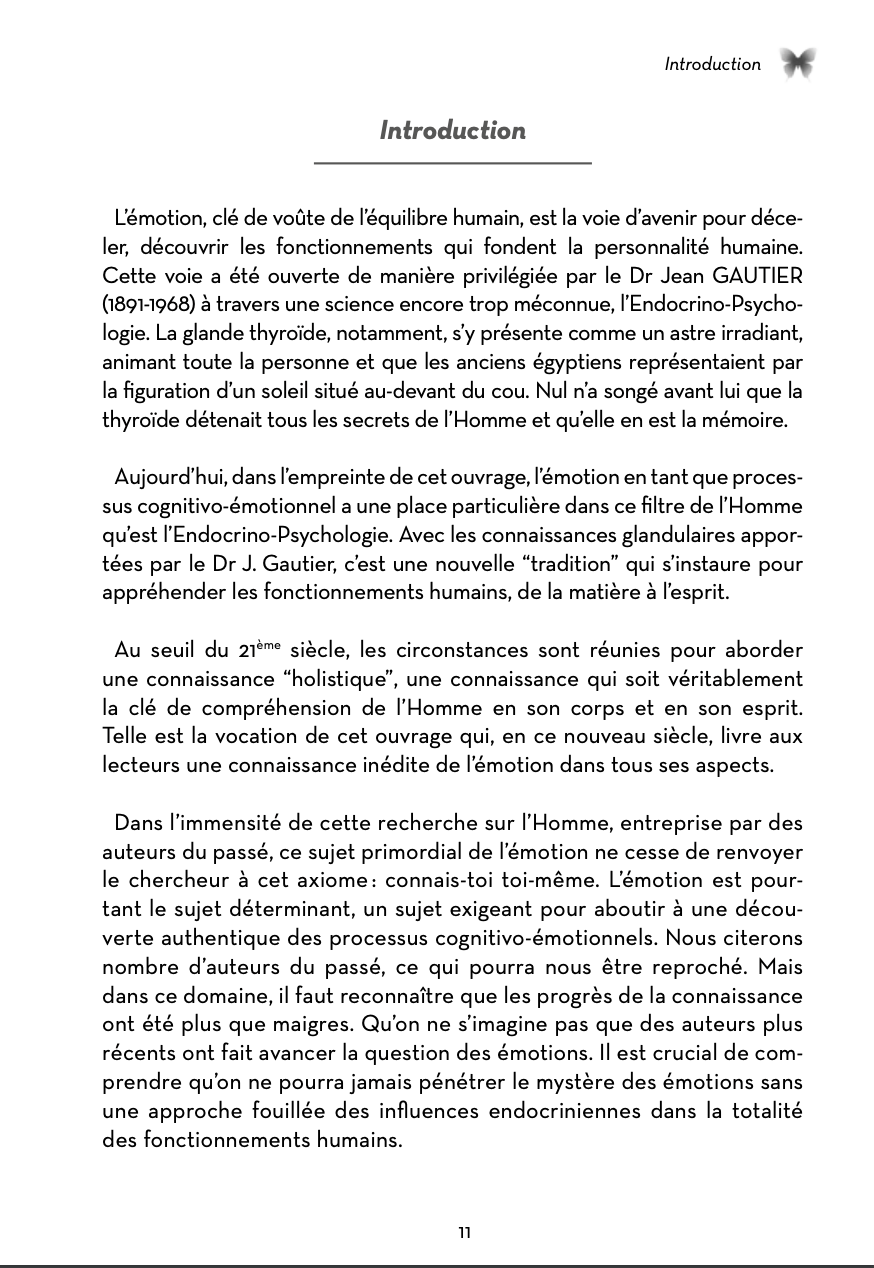L’émotion, clé de voûte de l’équilibre humain, est la voie d’avenir pour découvrir les fonctionnements qui fondent la personnalité humaine. Cette voie a été ouverte par le Dr Jean GAUTIER (1891-1968) à travers une science encore trop méconnue, l’Endocrino-Psychologie.