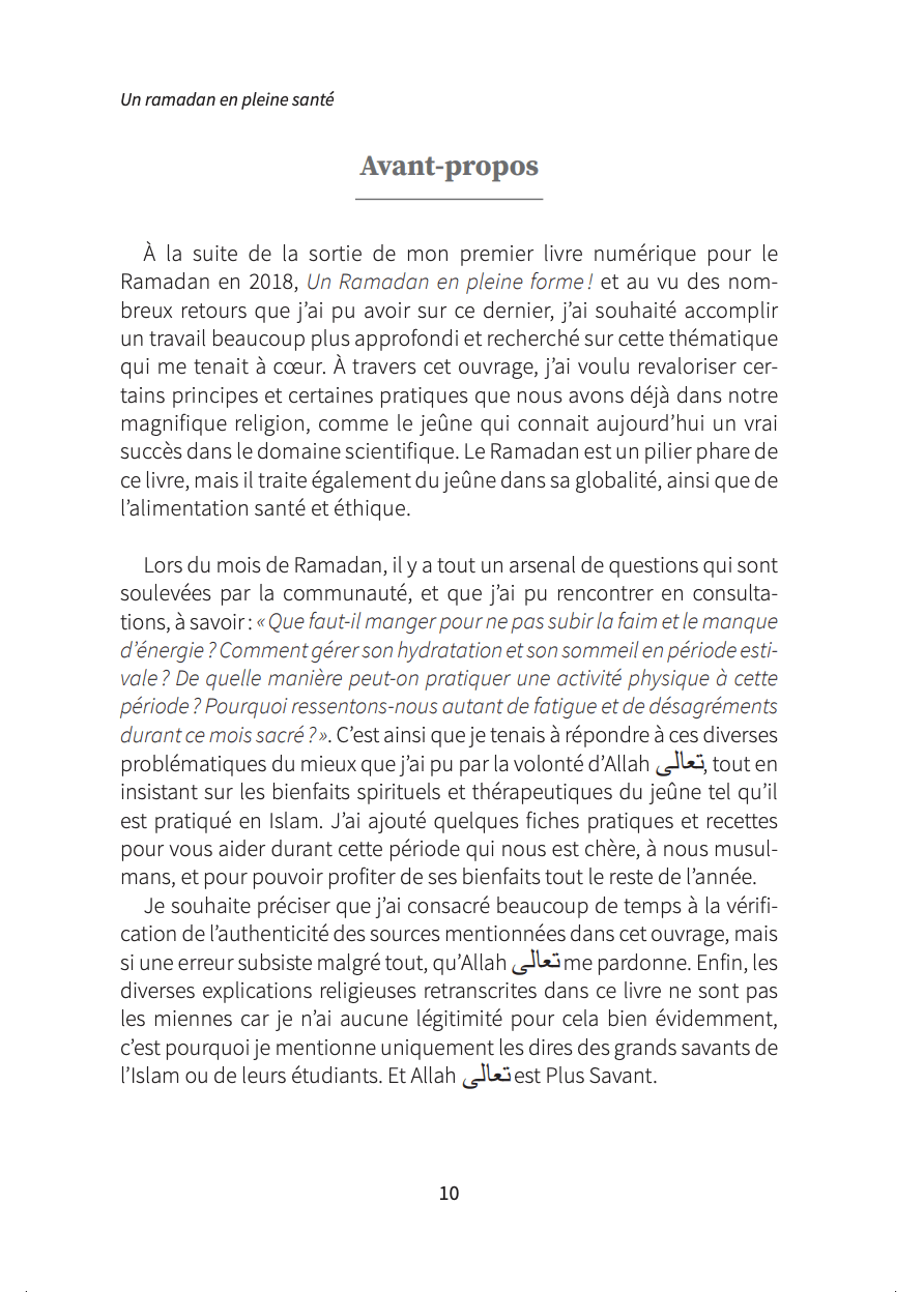 Cet ouvrage complet s’adresse non seulement à la communauté musulmane (bienfaits spirituels et thérapeutiques du jeûne y sont remis en avant, tel qu’il est pratiqué dans l’Islam), mais également à toute personne souhaitant prendre soin de sa santé.